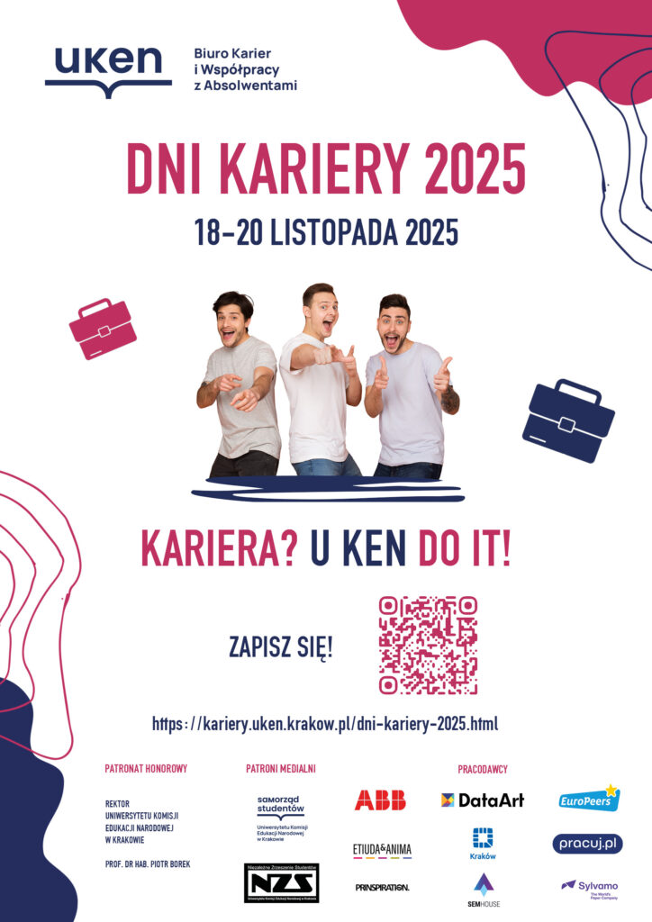 Dni Kariery „Kariera? U KEN do it” odbędą się w dniach 18–20 listopada 2025 r. w Auli Głównej (I piętro, budynek główny UKEN). Wydarzenie skierowane jest do studentów, absolwentów, słuchaczy oraz doktorantów Uniwersytetu Komisji Edukacji Narodowej. Każdego dnia odbędą się 3 spotkania z 3 firmami/instytucjami podczas tematycznych warsztatów.