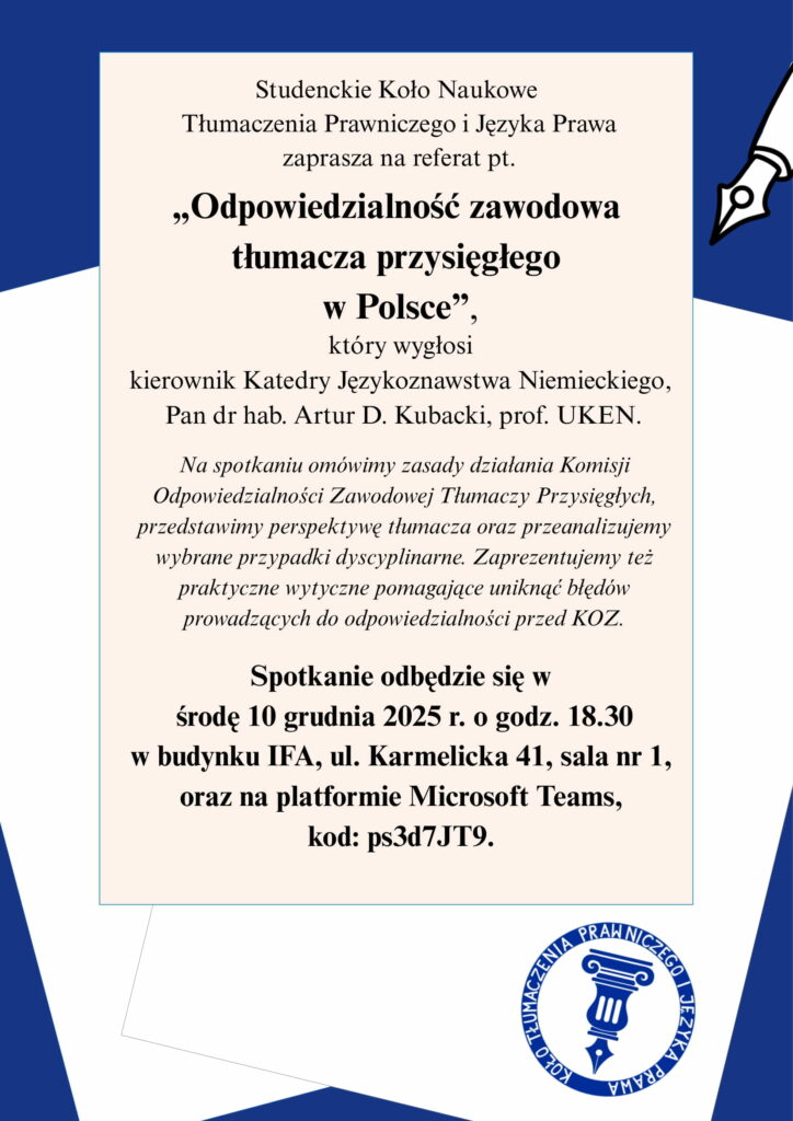 „Odpowiedzialność zawodowa tłumacza przysięgłego w Polsce” – wykład gościnny dr. hab. Artura Kubackiego, prof. UKEN, 10.12.2025
